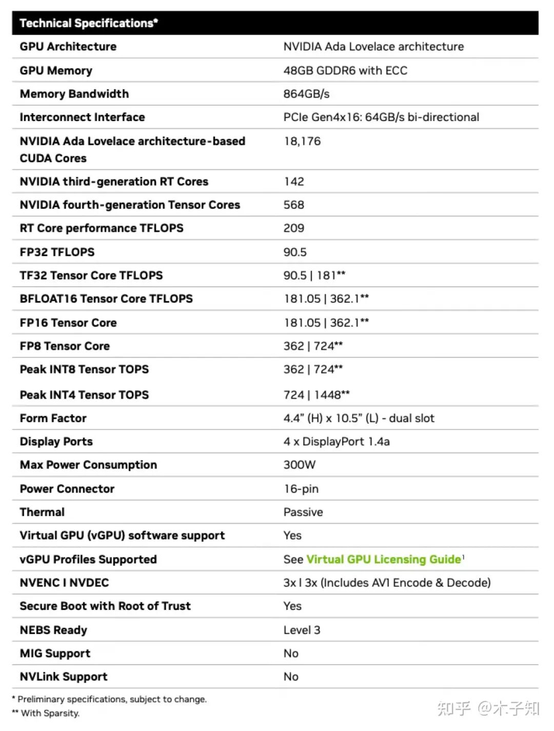 首先,以Nvidia L40 GPU为例,其硬件参数如下,可以发现FP8 Tensor Core和INT8 Tensor Core在各自数据类型上的计算能力是相同的,该硬件参数在H800、L20和L40S上也是相同的。