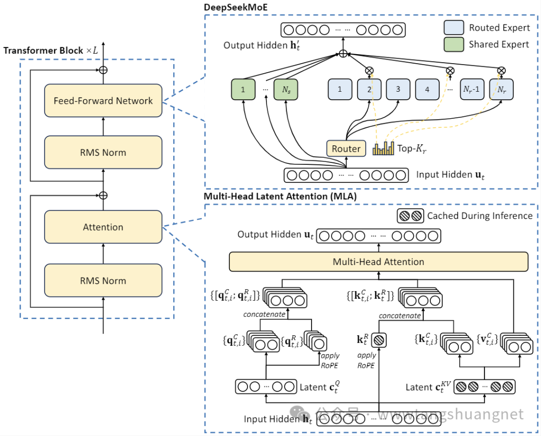DeepSeek-V2采用了MoE架构,特别是它对Transformer架构中的自注意力机制进行了创新,提出了MLA(Multi-head Latent Attention)结构,并使用MoE技术进一步降低计算量,提高推理效率。