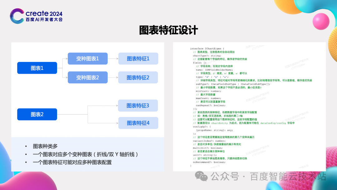 3.3 图表特征设计 每个图表都可以有多个特征,而且同一个图表可能会存在一些稍微不同的特性(例如折线和柱图的混搭)。如下方右侧图,为我们列举了图表特征的详细描述,特征核心其实就是描述一种图表如何绑定数据字段,例如图表可以绑定几个维度字段、几个度量字段,是不是必须要有维度字段,度量字段有数据单位时是否高优使用某种图表类型等等。我们把这些特性进行泛化,从而形成特征配置。