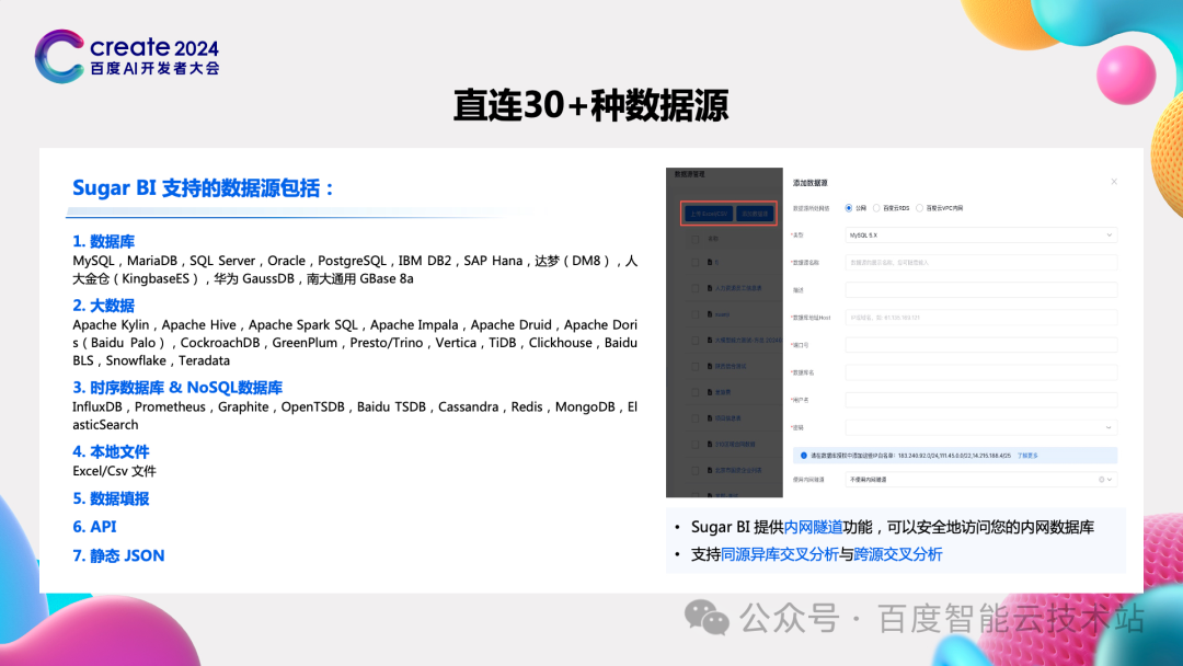 Sugar BI 基于百度开源的 Echarts 以及 D3 图表库,支持 150 多种可视化组件。同时内置多种主题风格,用户只需要简单的配置就能搭建出美观实用的可视化页面。 除了常见的二维图表,Sugar BI 也支持了三维图表以及一些 3D 地图类组件、媒体组件、三维场景等,能让您的可视化效果更进一步。 同时,Sugar BI 在易用性上也满足各类人员角色的需求。在报表页面开发时,Sugar BI 采用完全零代码、拖拽式操作,通过鼠标点选、拖拽组件就能完成可视化页面的设计和制作。每个图表组件都拥有非常完整和丰富的配置,用户以零代码的方式即可获得精美、酷炫的的数据可视化页面。 用户在 PC 上搭建好报表页面后,Sugar BI 页面的布局也会自动优化适配移动端。 这一切都不需要用户书写任何的代码和 SQL 语句,只要你懂数据、懂业务,就能完成对数据的快速可视化分析。 上面介绍了 Sugar BI 报表搭建相关内容,数据可视化同样也离不开可视化大屏。Sugar BI 内置了 60 多套专业设计的可视化大屏模板,涵盖了政务、教育、零售、金融、制造等垂直行业,能够满足大部分场景下用户的可视化需求。 并且 Sugar BI 的可视化大屏模板覆盖了 PC 和移动端两种不同的终端,用户基于模板,只需要对接自己的业务数据、并稍作修改,即可拥有炫酷的可视化大屏,真正做到开箱即用。 2 可视化 BI 分析技术 在 Sugar BI 定位于具有 AI 特色的可视化 BI 分析平台。为此,后续的工作我们着重突出了 Sugar BI 的三个能力:AI、BI、可视化。 下图是 Sugar BI 的整体架构图,我们将 AI、BI、可视化三大能力进行融合,使用容器化技术进行打包和部署。今天将为大家重点分享并剖析 Sugar BI 的 BI 与 AI 能力。 下面,我将分别给大家详细介绍 Sugar BI 的 BI 和 AI 能力。首先,为大家介绍 Sugar BI 的 BI 能力,如下图所示: 数据源:前面我们说过 Sugar BI 支持对接丰富的数据源种类,一共超过 30 种数据源,支持了达梦、人大金仓、华为 GaussDB 等国产数据库。 数据模型:Sugar BI 可以进行单表、多表 Join,支持视图以及用户自定义的 SQL 视图,并且对字段进行自动的维度和度量的划分。 BI 引擎:在数据的交互性方面,Sugar BI 支持筛选、下钻、联动等;同时,在数据计算方面,Sugar BI 支持了在 SQL 查询中就能实现的计算字段或分桶分组。 计算引擎:Sugar BI 也支持数据查询完之后的二次表计算,甚至支持了特定场景下的一些特殊的计算,如留存分析、交叉透视、监控预警计算等,满足您在不同场景下各类数据计算的需求。 另外,在跨越多数据源的联邦查询场景中,Sugar BI 利用开源 Presto 的能力,自己搭建和运维了 Presto 集群,让用户可以跨数据库的多表 Join 查询分析。