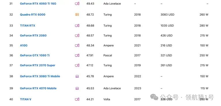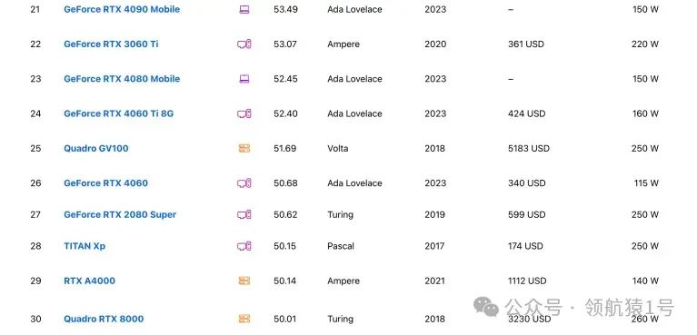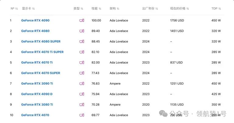 AI 领域常用 GPUAI 常用 GPU 价格排序这个表格依据价格进行排序,价格从低到高。更多排名看后面《NVIDIA显卡排行榜》章节介绍。