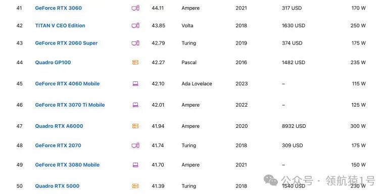 建议:若需高速下载,尤其依赖于 GitHub 或 Docker 官方镜像,建议选择国外服务器。 NVIDIA显卡排行榜此网站能实时对比各种型号显卡 https://technical.city/zh/video/nvidia-rating Top 100下面截图给大家 Top 100,详细请看原文链接。