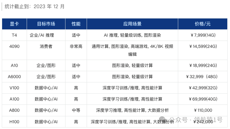 - 对于公司的大规模数据和复杂模型,推荐使用如 NVIDIA A100 的高性能 GPU。