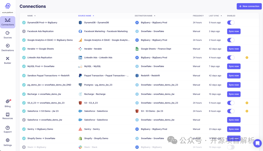 2. 广泛的连接器支持:Airbyte 提供了大量的连接器,支持从各种数据源(如数据库、API、云存储等)和目标系统(如数据仓库、数据湖、数据库等)中提取和加载数据。