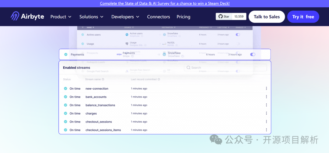 6. 开箱即用:Airbyte 提供了开箱即用的数据同步解决方案,用户无需编写代码即可设置和维护数据流。