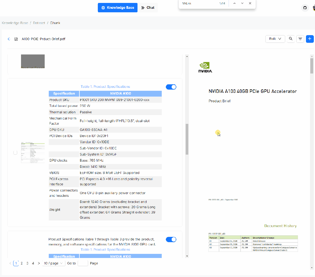 尤其是处理PDF文档时,因为PDF格式多样且在各个行业中广泛使用,所以保持对处理过程的控制尤其重要。ragflow不仅展示处理的最终结果,还允许用户查看文档解析的具体细节。