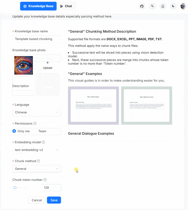 在处理文档时,RAGFlow 提供了多种选项:问答、简历、纸张、手册、表格、书籍、法律、一般文档等