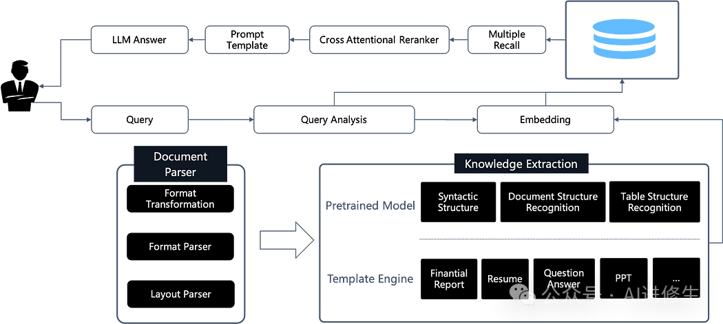 通过智能解析,将数据准确录入数据库,允许用户使用任何大型语言模型查询其上传的文档。本质上,RAGFlow 包含以下端到端流程: