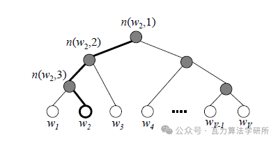 层次softmax首先利用树结构的叶节点表示词库中的每一个词,从根节点到叶节点的路径,每一个中间路径都对应着一个概率,某个词出现的概率的计算方式改为路径上所有中间路径概率的乘积,那么现在有一个问题就是中间路径的概率是怎么得到的,其实它们正是要学习的参数,但是它们是怎么表示的呢?