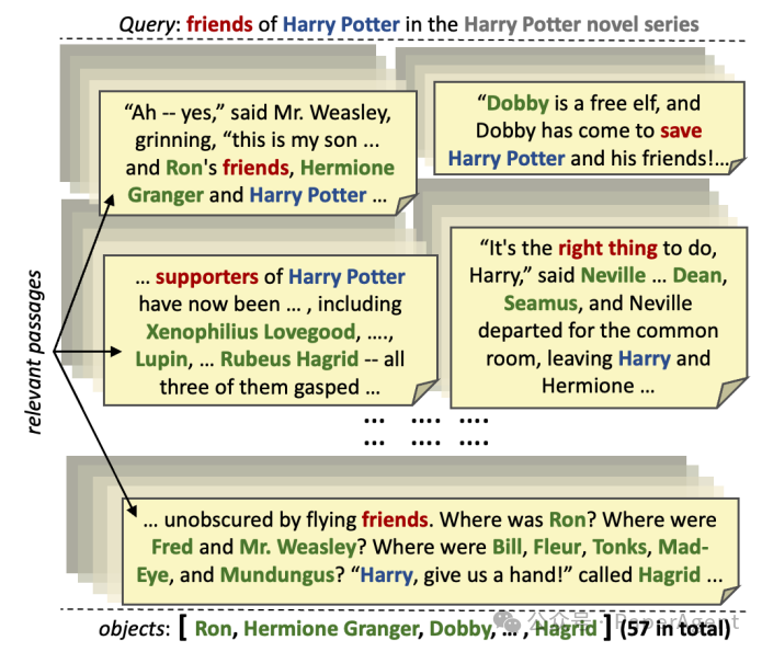 从长文本中提取长列表的示例。以主题‘哈利·波特’为例,目标是提取整个系列书籍中出现的57位朋友。