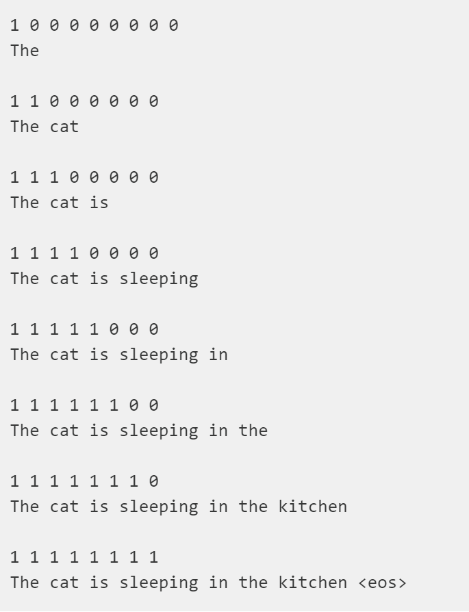例如,在处理句子 "The cat is sleeping in the kitchen" 时,采用的注意力掩码确保了模型在预测时只考虑它之前的词。这一点是通过在训练中应用特殊的"掩码"实现的,从而让模型只"看到"当前词之前的词,不考虑当前词之后的词。