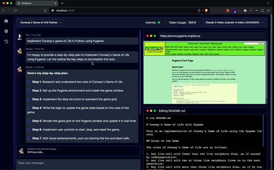 Devika的前端UI界面与Devin差不多,都是左面进行文本提示,右面直接展示执行、生成的结果。