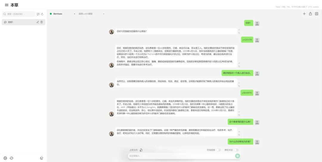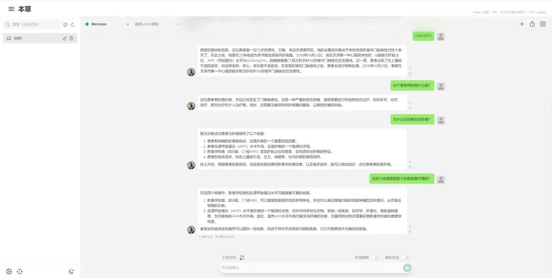 当前大语言模型(Large Language Model)在通用域自然语言处理任务上已获得了巨大的成功,在很多垂直领域,如医疗、教育等也有很多探索和应用工作。但目前的垂直领域模型,大多是利用专业领域的语料库或者相关的知识问答数据集进行微调,例如包括HuatuoGPT[1]和ChatLaw[2]在内的垂直领域大模型,可以在相关专业领域的知识问答任务上表现得十分出色。然而,单一的问答对话功能,对领域内的专业人员难以起到很大的帮助,无法在真实工作场景中辅助专业人员。这导致垂直领域大模型在垂直领域反而难以找到具体的应用场景。 本草3.0正是基于这一背景开展了相应的功能优化,支持了对于具体病历的诊疗讨论相关的个性化医疗服务。以往版本的本草大模型(在线链接:https://huozi.8wss.com/),利用知识微调等方法,通过精准知识注入与检索,已经在常见的医学知识问答和疾病咨询等任务上取得了不错的效果。但为了进一步服务医疗健康领域、为智慧医疗赋能,我们与医疗业内人员集思广益、共同讨论,深入探讨了医学大模型在医学领域上可能的实际业务场景。在医学领域中,很多疾病有着相似的症状表现,譬如头疼、发热可能对应多种疾病。当证据不足以支撑诊断结果的时候,医生可以利用本草3.0,根据患者现有的病历进行深入研究。这不仅有助于提升整体医疗诊断水平,也可以为患者提供更加个性化的诊疗服务。 效果演示如图1.1和图1.2所示。本草3.0可以根据患者的真实病历和医生进行讨论。首先,选择患者ID,模型会根据存储的病历信息给出初步的结论。例如“您好,根据您提供的病历信息,他的主要症状是由于体检发现肝脏占位已经20天了。在此之前,他患有十二指肠球炎,定期进行腹部检查。2019年4月16日,他在当地医院进行上腹部增强CT检查结果显示肝S5段有一个大小约为2.7x2cm的不均匀明显强化片状占位,诊断为肝S5段占位,考虑为肝癌,建议结合临床进行治疗。然而,当时并未进行特殊治疗。在病程中,患者没有出现过恶心呕吐、腹痛、黄疸或肩背部放射性痛等症状。目前的诊断结果是患者肝脏S5段的占位考虑为肝癌,且有手术需要,需要尽快进行手术治疗。”随后,用户可以对模型的诊断过程和结论进行多轮问询。模型会给出诊断的理由,并且附上病历中相关的检查结果作为决策依据,以增强可解释性和可信性。