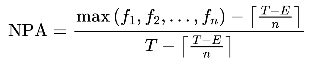 2.医学大模型评价2.1.介绍随着大语言模型在医学领域上的发展,构建一个好的评价方式愈发重要,但是,当前的评价方式或多或少地存在一些缺陷,导致评测结果不能准确反应模型性能,从而影响评测结果的公正性。其中,使用选择题评估大语言模型能力的方法存在显著问题。由于大语言模型对同一问题可能给出不同的答案,这种回答的不一致性导致选择题上的性能指标无法全面准确地反映模型的实际性能。为此,我们设计了多组实验,从单选题的一致性分数、医学领域的复杂问题等角度对多个医学大模型进行评测。 2.2.选择题评测结果首先,为了准确评估选择题测验结果的公正性,我们引入了一个新的度量标准,称为“标准化多数一致性”(Normalized Plurality Agreement,缩写为NPA)。这个指标代表的是,当针对选择题的各个选项进行多轮随机打乱处理后,出现频率最高的选项所占总测试次数的比例的修正值(取值范围:0~1),其计算公式如下所示。