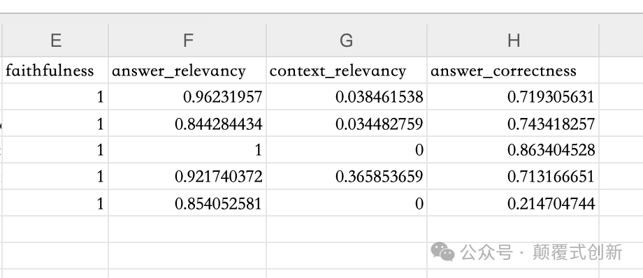 metrics = [faithfulness,answer_relevancy,context_relevancy,answer_correctness,]answers = []contexts = []for q in questions:response = query_engine.query(q)answers.append(response.response)contexts.append([sn.get_content() for sn in response.source_nodes])data = {"question": questions,"contexts": contexts,"answer": answers,"ground_truth": ground_truth,}dataset = Dataset.from_dict(data)result = evaluate(dataset, metrics)result.to_pandas().to_csv("output/ragas-evaluate.csv", sep=",")