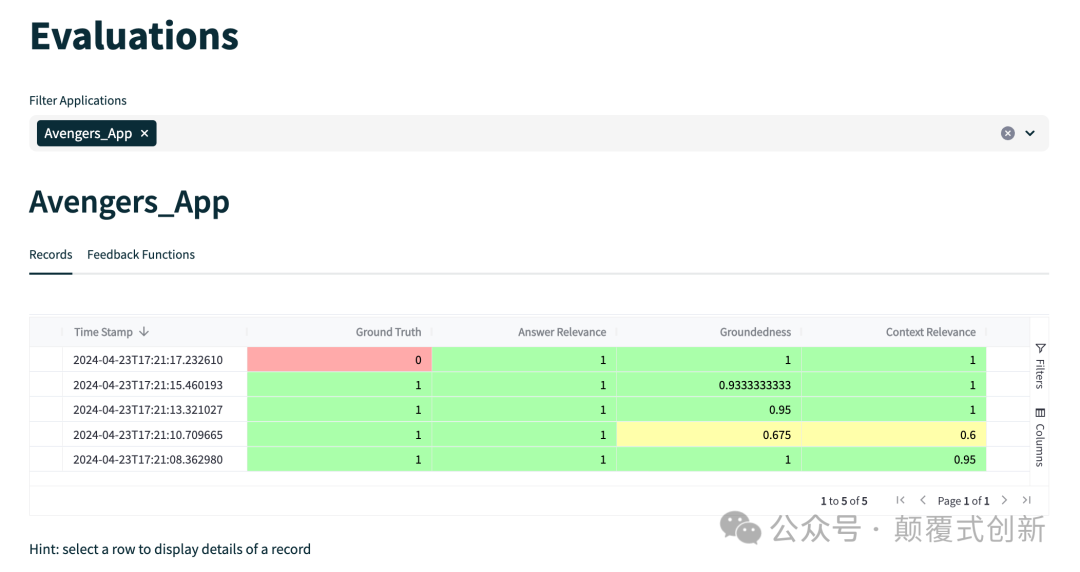 TruLens的评估结果可以通过浏览器访问本地服务来查看。评估结果包括总体得分和详细指标。得分背后的原因也是可见的。以下是TruLens评估结果的示例: