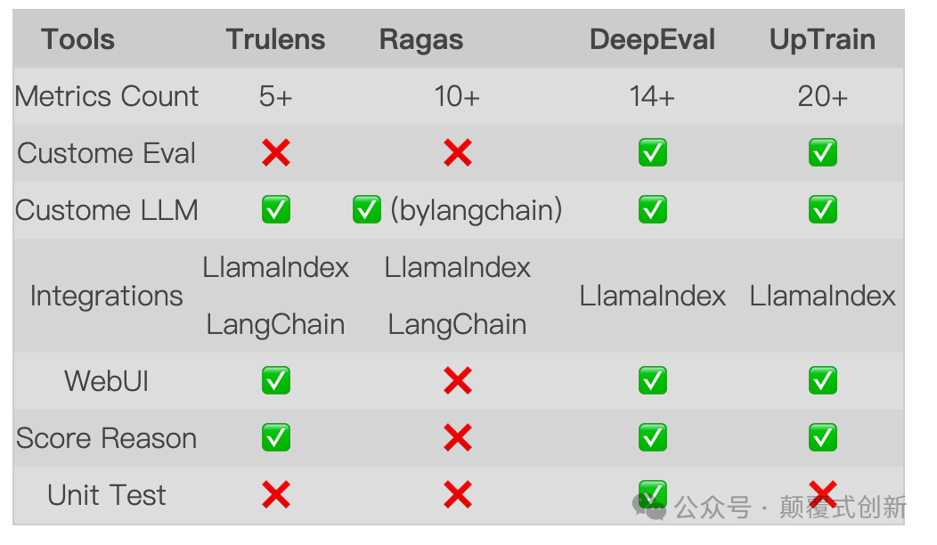 TruLens 和 Ragas 是最早的 RAG 评估工具之一,而 DeepEval 和 UpTrain 则是后来出现的。这些更新的工具可能受到早期工具的启发,从而拥有更全面的指标和改进的功能。然而,TruLens 和 Ragas 仍然具有独特的优势,例如 TruLens 直观的结果和 Ragas 为 RAG 应用量身定制的指标。
