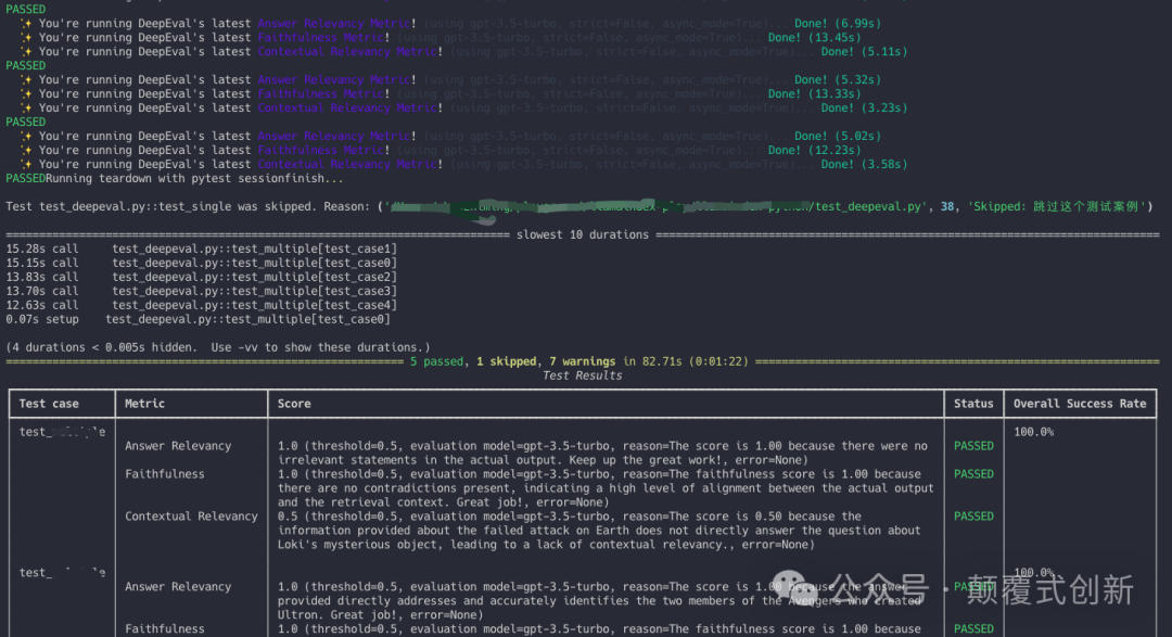 运行测试文件 deepeval test run test_deepeval.py 来执行评估任务。DeepEval 会在终端输出评估结果。如果测试通过,您将看到 PASSED;如果没有,将看到 FAILED。