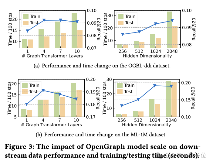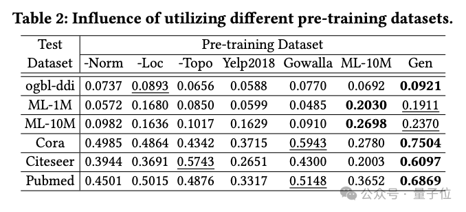 数据生成技术的影响团队调查了不同预训练数据集对OpenGraph性能的影响,包括使用基于LLM的知识蒸馏方法生成的数据集,以及几个真实数据集。 实验中比较的预训练数据集包括从团队生成方法中移除某项技术后的数据集、2个与测试数据集无关的真实数据集(Yelp2018和Gowalla)、1个与测试数据集类似的真实数据集(ML-10M)。 实验结果显示,生成数据集在所有测试集上均展示了良好性能;三种生成技术的移除都显著影响了性能,验证了这些技术的有效性。 使用与测试集无关的真实数据集(如Yelp和Gowalla)训练时,性能有时候会下降,这可能是由于不同数据集之间的分布差异。 ML-10M数据集在与之类似的测试数据集(如ML-1M和ML-10M)上取得了最佳性能,突显了训练和测试数据集相似性的重要性。