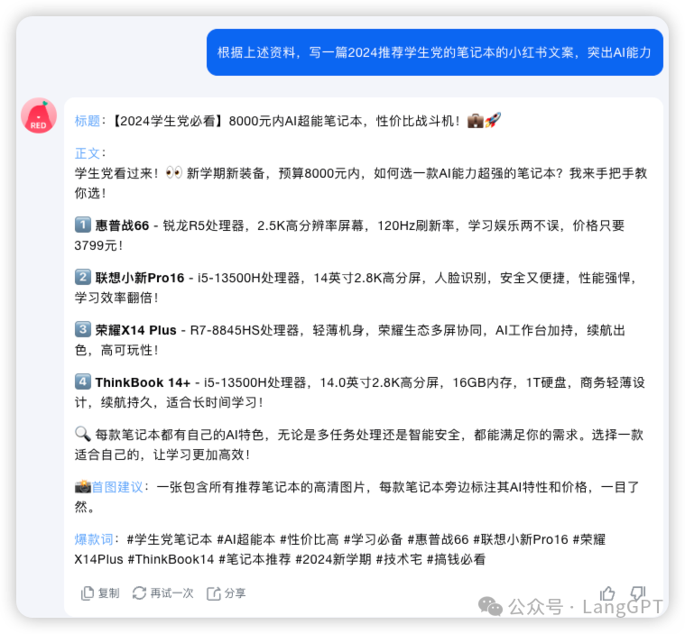 之后在这四款推荐上,直接@小红书爆款生成器生成一篇小红书?推文,纵向丝滑。Prompt:「根据上述资料,写一篇2024推荐学生党的笔记本的小红书文案,突出AI能力」