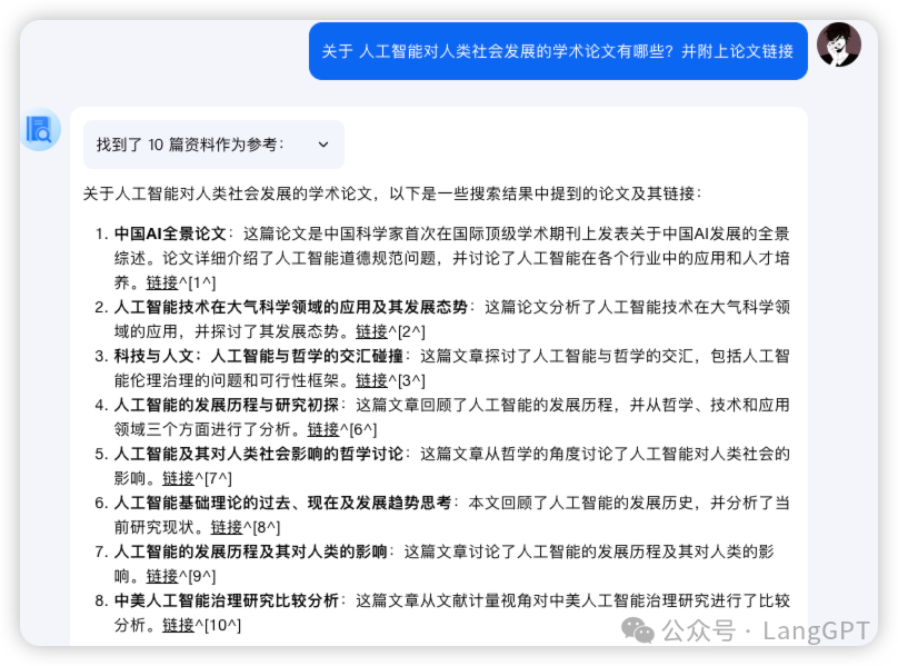 我们在首页直接召唤「学术搜索」助理,输入 prompt「关于人工智能对人类社会发展的学术论文有哪些?并附上论文链接」