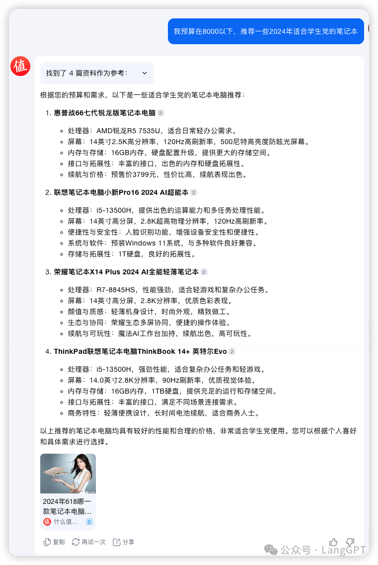 比如我们想推荐2024年最受欢迎的智能耳机,直接 @什么值得买助手,Prompt:「我预算在8000以下,推荐一些2024年适合学生党的笔记本」,可以看到直接推荐了四款笔记本供选择。