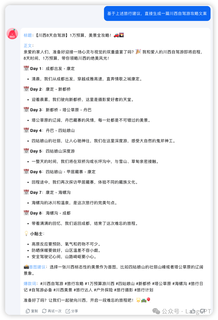 接下来老规矩,直接@小红书爆款生成器生成一篇小红书?推文,纵向丝滑。Prompt:「基于上述旅行建议,直接生成一篇川西自驾游攻略文案」