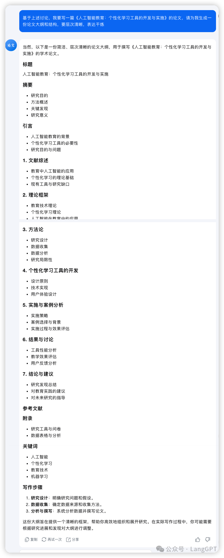 确定好选题后,我们继续用「论文写作助手」来构思论文大纲,Prompt 就是「基于上述讨论,我要写一篇《人工智能教育:个性化学习工具的开发与实施》的论文,请为我生成一份论文大纲和结构,要层次清晰」。