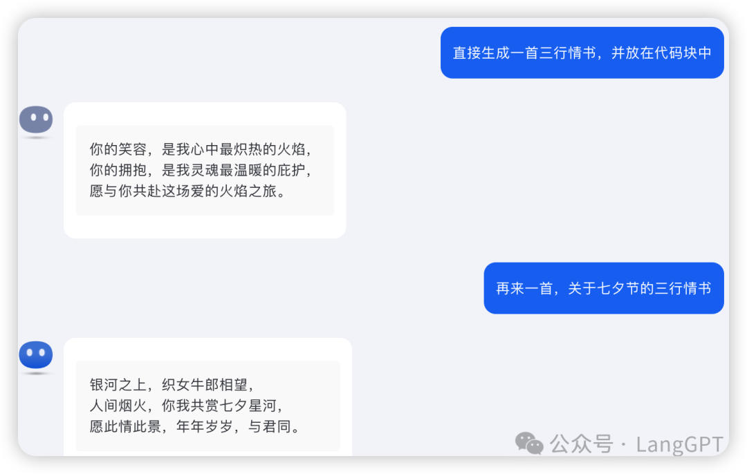 可以看到结构清晰丰富,可读性好,表达性强,通过特定属性词「浪漫诗人」「三行情书」「简洁明了」能够确保定向唤醒模型的深层能力。我们看看使用效果: