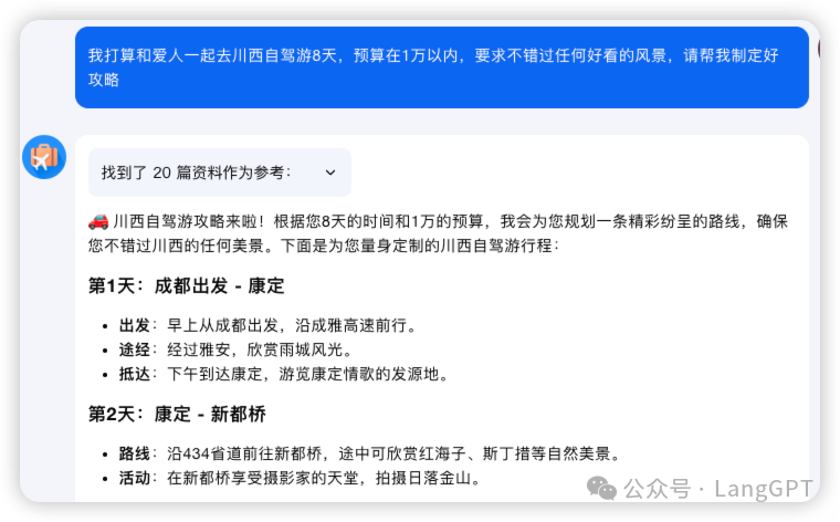 直接 @旅行规划师,说明我们的诉求:Prompt:「我打算和爱人一起去川西自驾游8天,预算在1万以内,要求不错过任何好看的风景,请帮我制定好攻略」。
