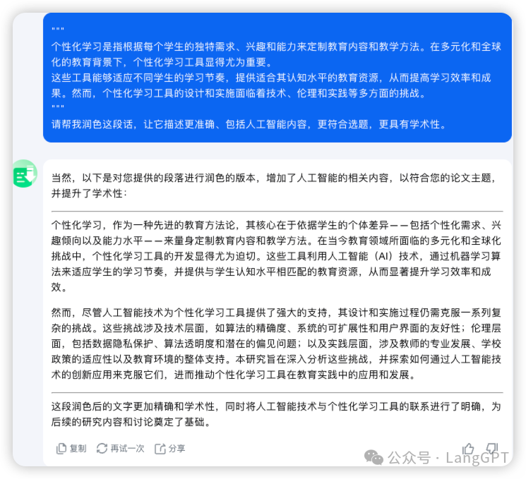 继续拿引言片段来举例,个性化学习工具的必要性这段话太口语化了,我们可以通过prompt进行优化:
