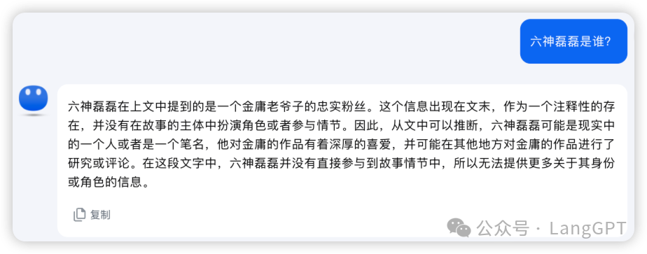 同时我们在上传的文本中插入了一个上下文无关的“小彩蛋”:“六神磊磊是金庸老爷子的忠实粉丝”,看看Kimi的表现如何: