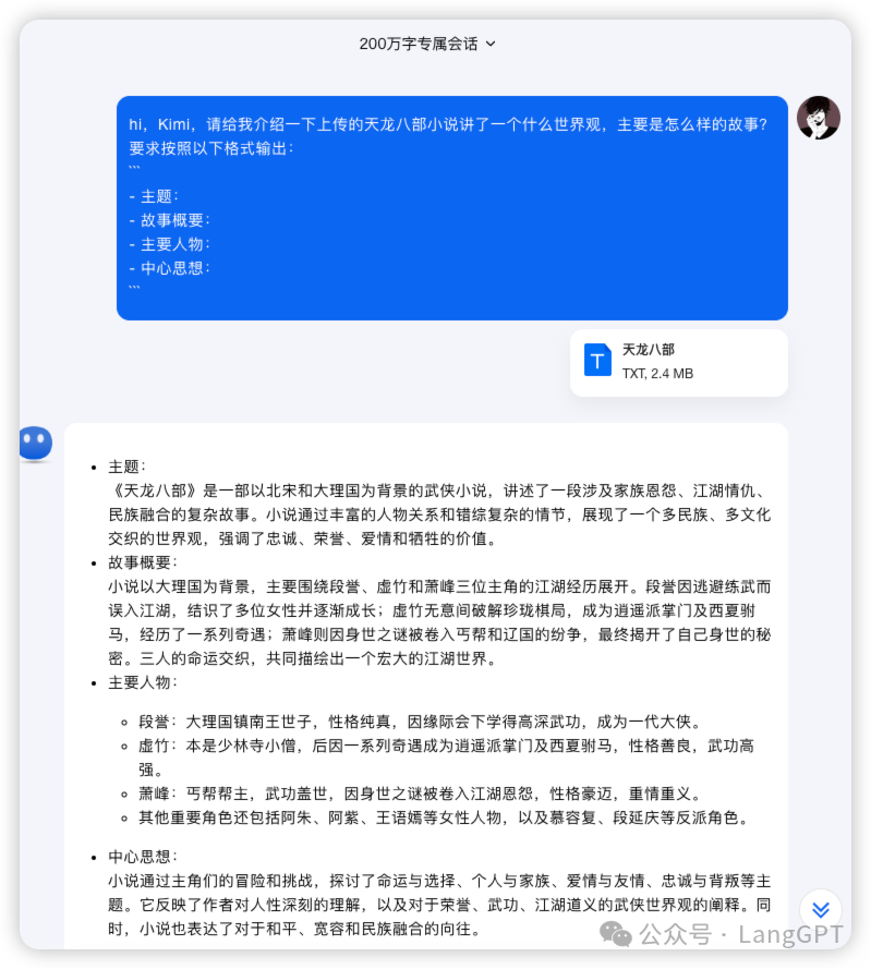 作为一名金庸迷,甲木也曾在年少之时向往江湖的快意恩仇、儿女情长,每个年轻人的心里都有一个武侠梦,这里就让Kimi带我们回顾那草莽并起,群雄纷争的江湖——《天龙八部》,我们直接把整本小说喂给“鹿康太”,看看它的长文本处理能力~