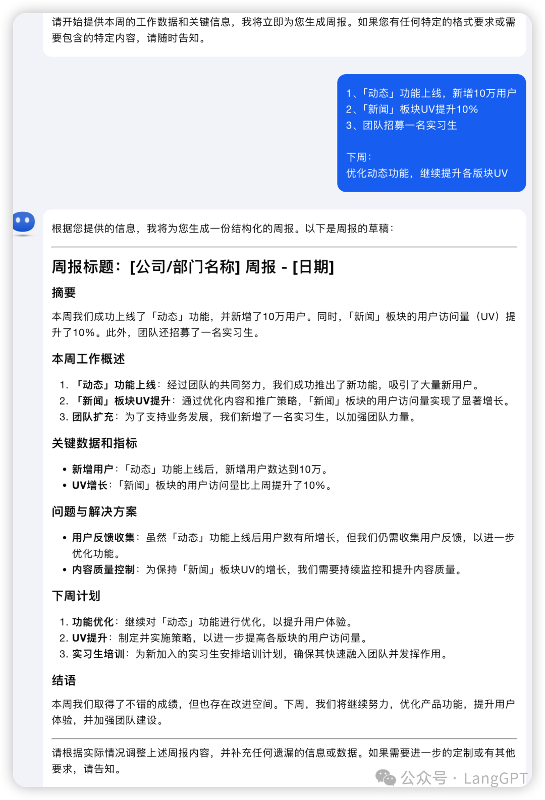 - OutputFormat: 结构化的文档,包含标题、摘要、本周工作概述、关键数据和指标、问题与解决方案、下周计划等部分。