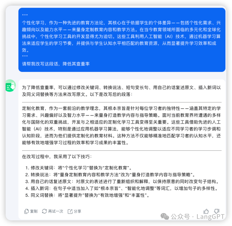 同样的,对于其中查重率过高的语句,我们还可以让它一键降重,prompt「"""待降重语句""" + 请帮我改写这段话,降低其查重率」