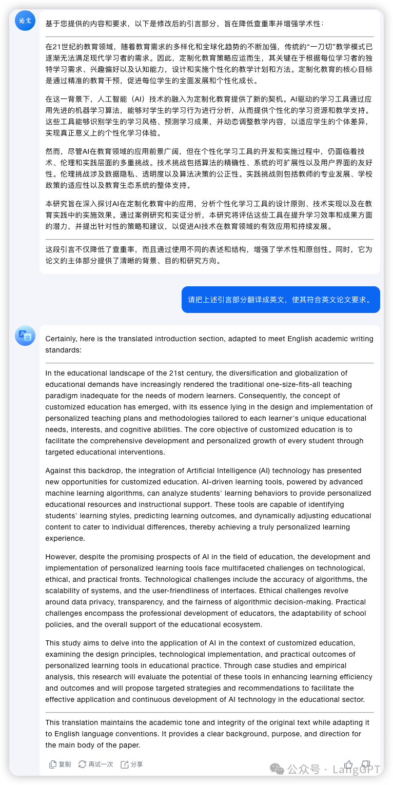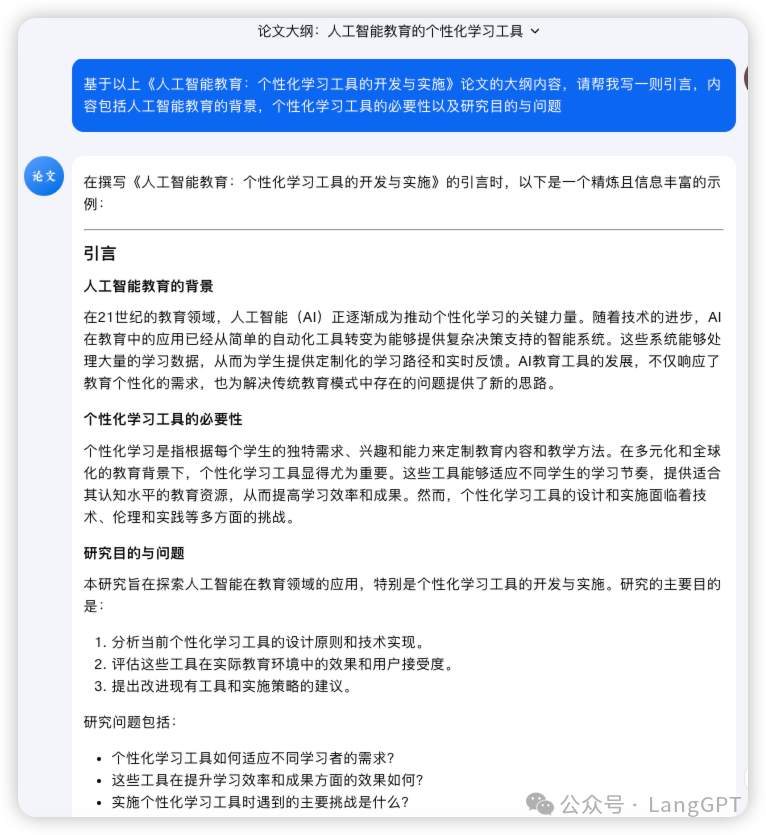 这里拿引言部分举例,我们输入的 Prompt 为「基于以上《人工智能教育:个性化学习工具的开发与实施》论文的大纲内容,请帮我写一则引言,内容包括人工智能教育的背景,个性化学习工具的必要性以及研究目的与问题」