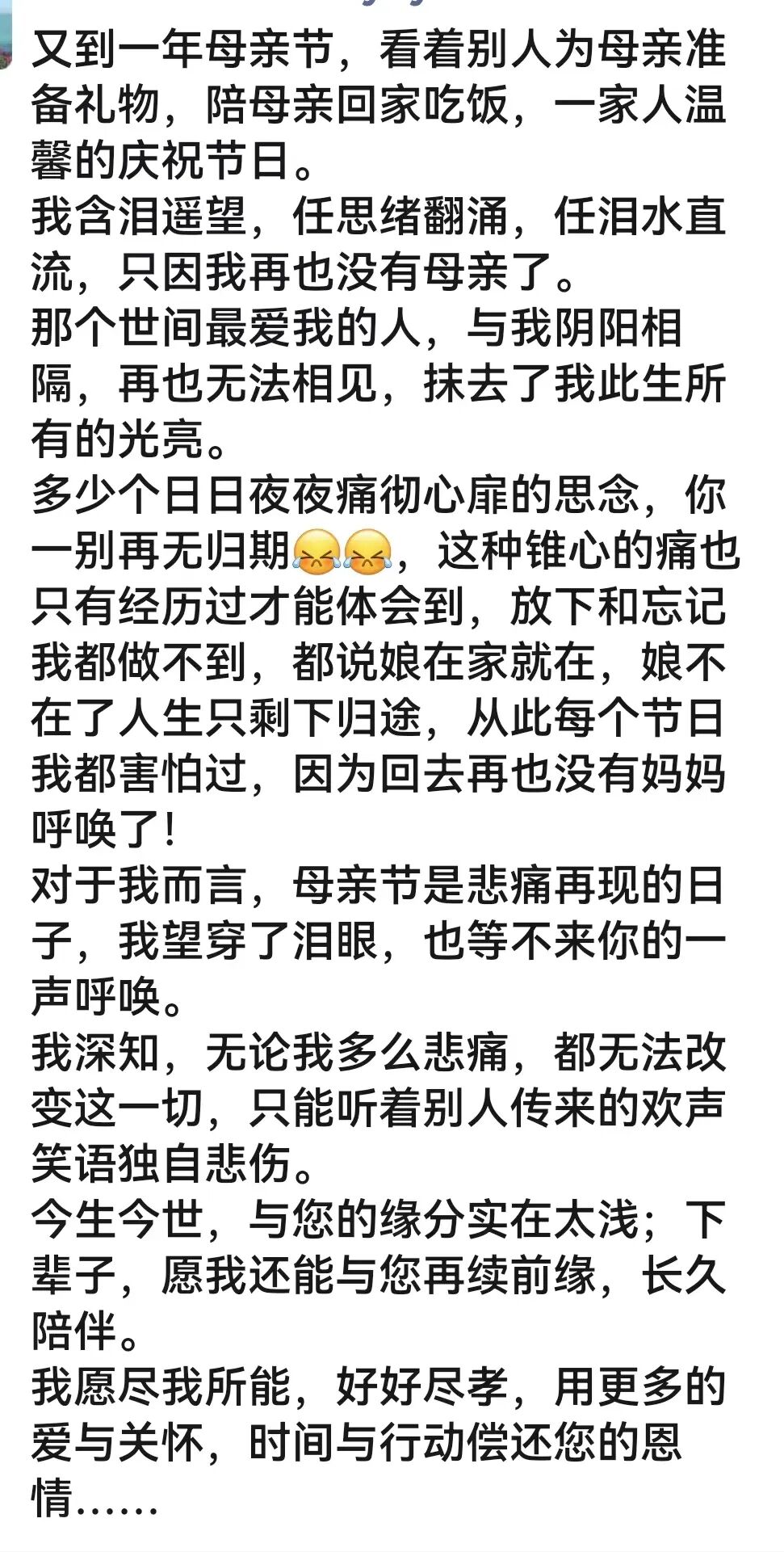 昨天母亲节,很多人都有发了母亲节感想,有的表达对母亲的感恩,有的表达对母亲的思念,其中,我看到一个网友发的母亲节感想不禁潸然泪下,这个朋友发的感想是这样的: