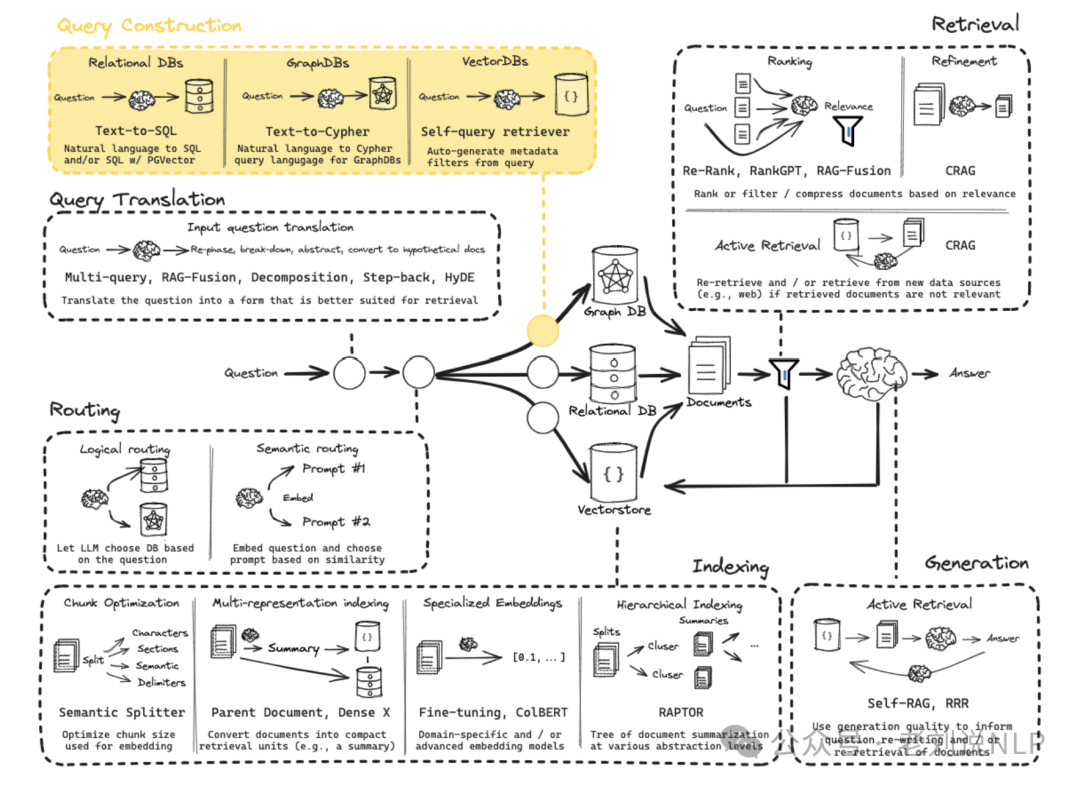 Query Construction,主要解决的问题是不同检索知识库,如mysql数据库、图数据库GraphDB、向量化数据库vectorDB的查询转换。使用LLM将自然语言转换为其中DSL是一种与给定数据库(SQL、Cypher等)交互所需的领域特定语言:https://blog.langchain.dev/query-construction/,https://blog.langchain.dev/enhancing-rag-based-applications-accuracy-by-constructing-and-leveraging-knowledge-graphs/