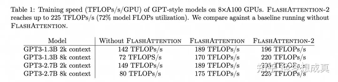 参考Flash attention v2论文,参考:https://zhuanlan.zhihu.com/p/645376942 博主讲的很清楚,总的来说,v2相比v1,减少了非矩阵乘法运算(non-matmul)的FLOPs,将任务分配给不同的thread block进行并行计算,充分利用GPU资源,在一个thread block内部分配任务给不同的warps,以减少访问共享内存次数。这些优化方案使得FlashAttention-2的速度提升了2-3倍。 原文的实验如下,注意这里的指标是TFLOPs/s 表示 1万亿次浮点指令每秒。这里TFLOPs/s 翻倍并不代表模型吞吐量翻倍。也就是吐出token/s。吐出token/s可以参考