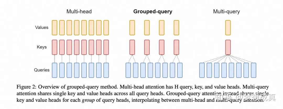 MQA和MHA的折中版本,MQA会小幅降低性能,所以为了在牺牲更小性能前提下加速,GQA应运而生,GQA就是每几组kv共享参数。这个过度事实上非常缓慢,毕竟 Group Conv的演变早很多。