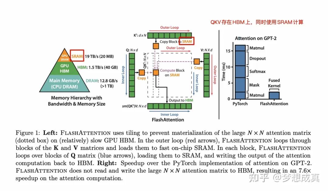 Flash attention 这个一般主流LLM都使用了,主要思想是分配计算,榨干GPU GPU主要分为计算单元(如浮点运算单元)和内存层次结构。大多数现代GPU包含专用的低精度矩阵乘法单元(如Nvidia GPU的Tensor Core用于FP16/BF16矩阵乘法)。 内存层次结构分为高带宽内存(High Bandwidth Memory, HBM)和片上SRAM(也称为shared memory)。以A100 GPU为例,它具有40-80GB的HBM,带宽为1.5-2.0TB/s,每个108个streaming multiprocessors共享的SRAM为192KB,带宽约为19TB/s。 参考Flash attention论文,QKV运算的中间结果不用放在HBM,而是放在SRAM上,FlashAttention可以将内存开销降低到线性级别,并实现了2-4倍的加速,同时避免了对中间结果的频繁读写,从而提高了计算效率。
