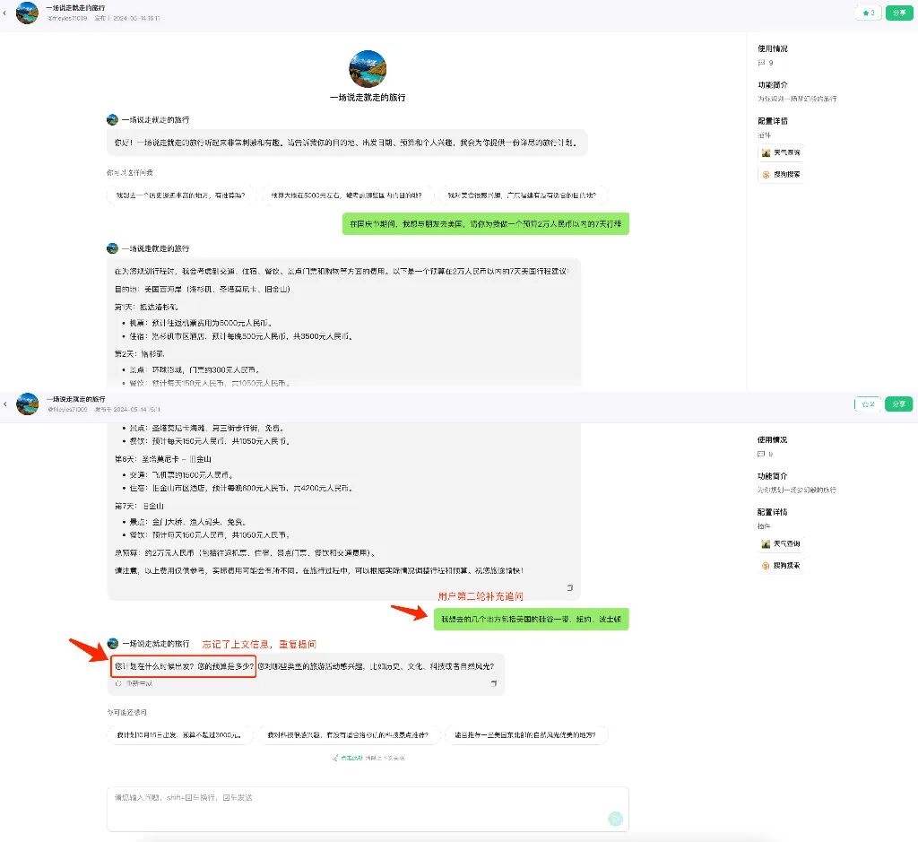 用户可以搜索商店内的智能体,复制智能体的分享链接,收藏智能体,以及与智能体对话体验;但是在笔者随机体验的一个商店内的智能体时,在没有超出上下文长度的情况下,似乎遇到了预期之外的多轮对话上下文关联异常的情况,即便官方的操作文档里表示通过元器平台创建的智能体支持32k token上下文长度。