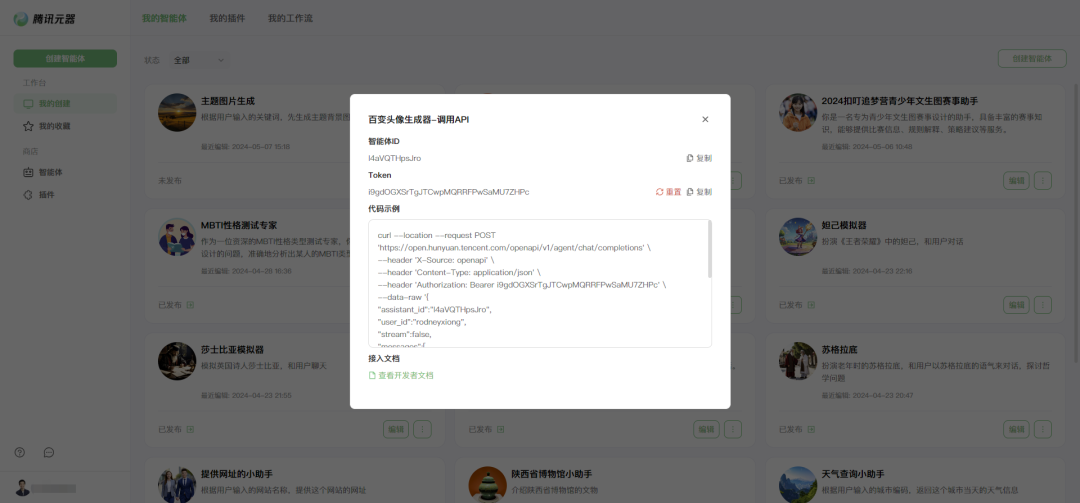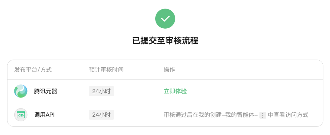 用户点击发布后,创建的智能体便来到了平台审核流程,平台预计 24 小时内完成审核,并且通过审核的智能体还可支持调用其 API。(详细操作步骤可见腾讯元器官网操作文档)