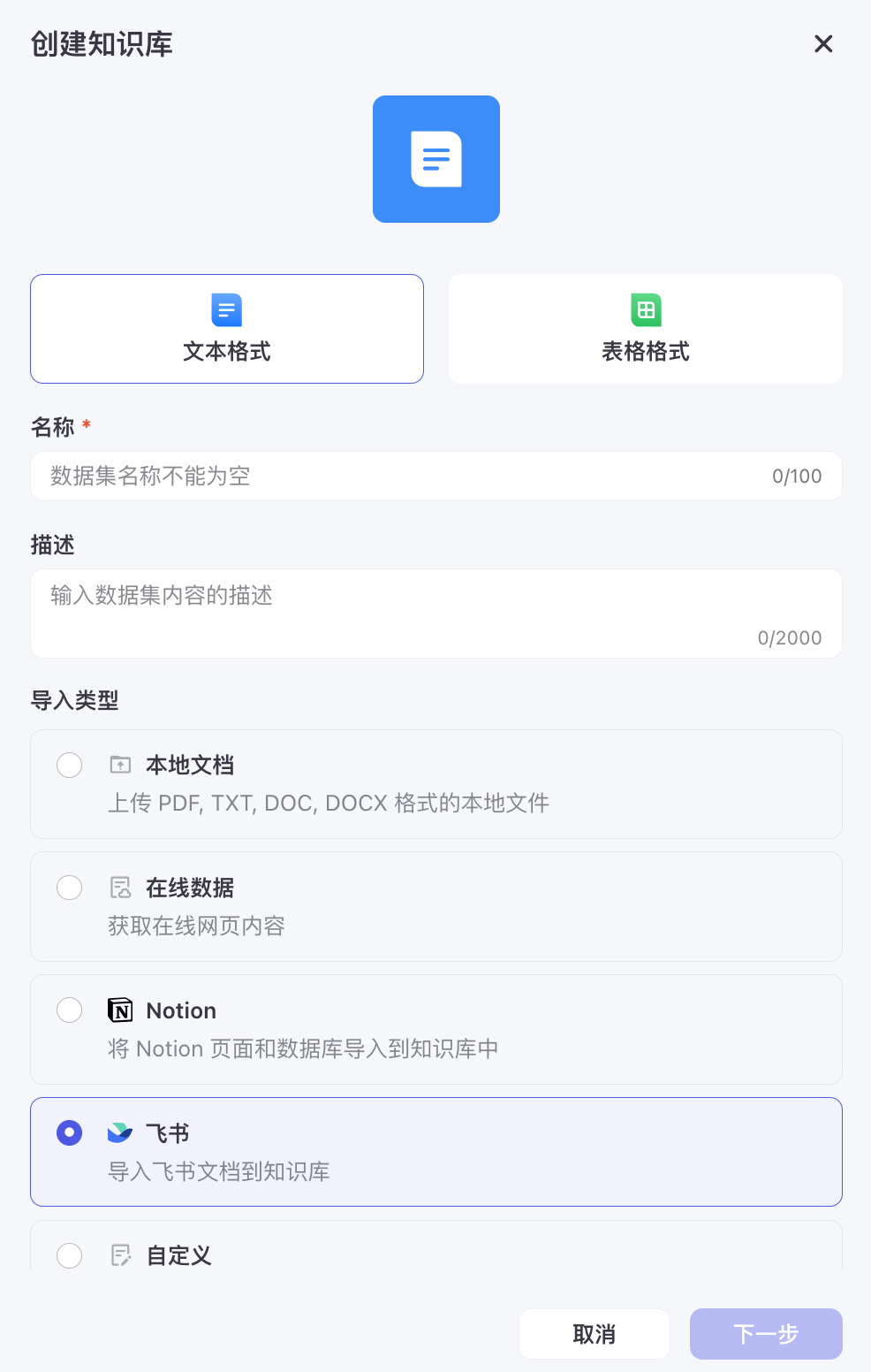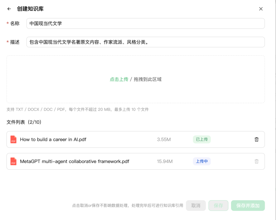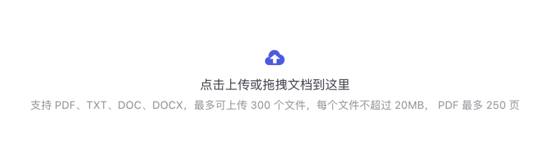 ○用户可创建自己的知识库,目前仅支持本地上传/拖拽文件,格式支持 TXT / DOCX / DOC / PDF,最多上传 10 个文件,每个文件不超过 20 MB