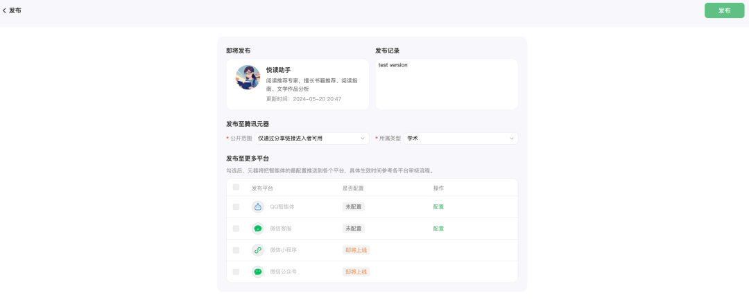 在智能体的「发布」页,用户可填写发布版本记录,设置公开范围,选择所属类型;用户还可将智能体配置发布至 QQ、微信客服、微信小程序(即将)、微信公众号(即将)这些腾讯生态体系内的社交产品渠道,获得使用场景和流量扶持,不过这些也需要一定的核验准入门槛。