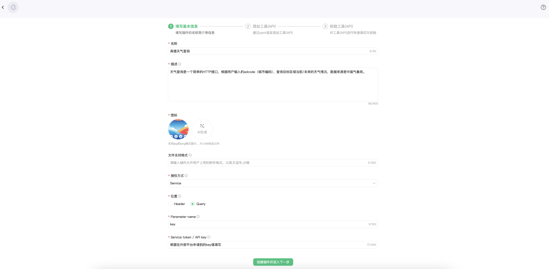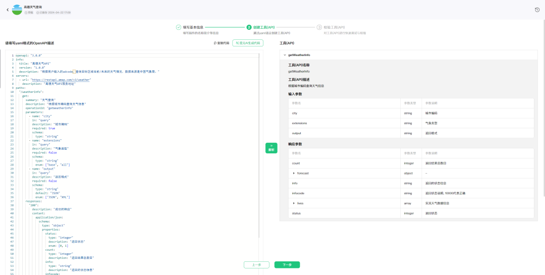 ●创建工具(API):元器目前支持开发者提供 YAML 格式的 API 描述(Schema),描述规则遵循 OpenAPI 格式要求;然后根据描述自动解析 API 信息;成功解析到 API 信息后即可进入到下一步