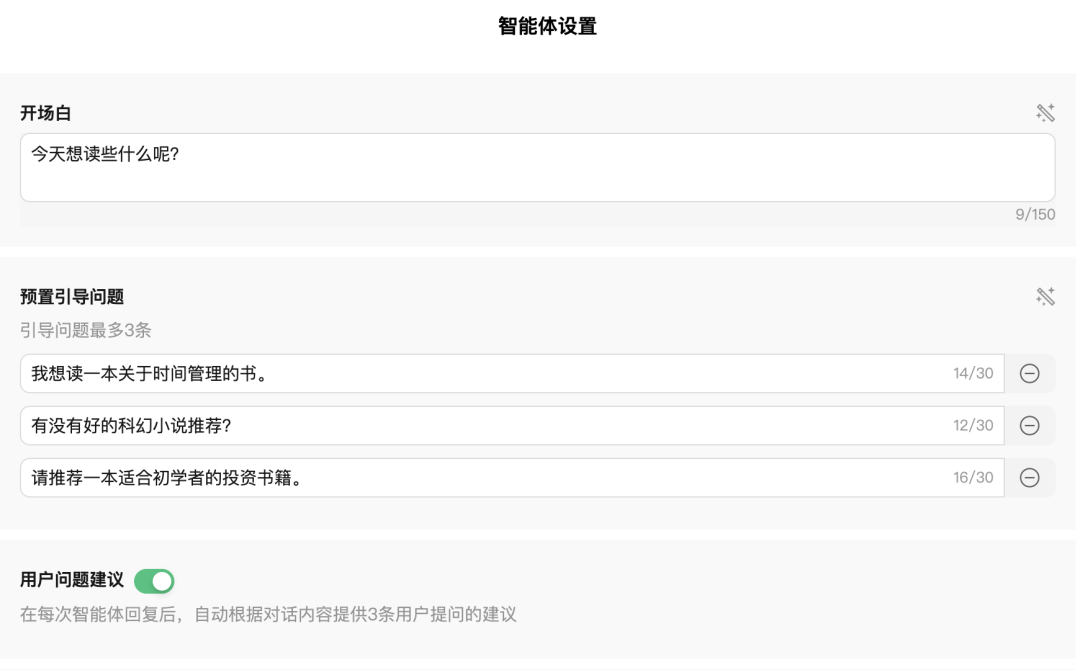 ●预置引导问题:支持 AI 辅助生成,最多添加3条引导问题,每条引导问题最多 30 个字
