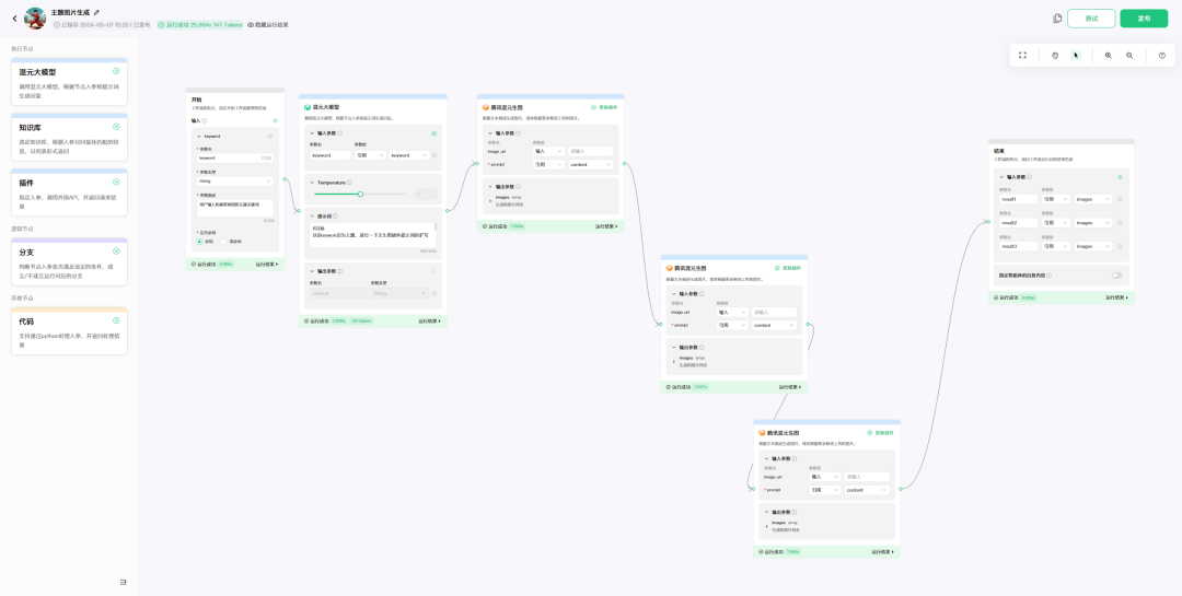 ●执行节点:按需自由拖拽 5 类执行节点至工作流中;支持使用混元大模型,知识库,插件