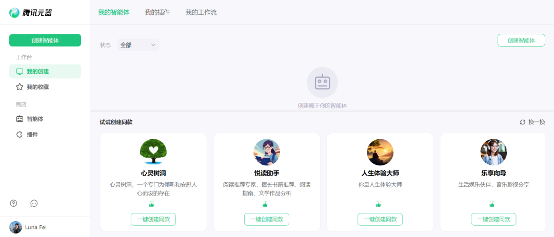 另外,由于目前元器平台刚刚发布,还处于小范围放量阶段,所以平台内尚未形成良好的创作者生态;具体表现为商店内还没有更多真实用户自建的优质智能体或插件,还有一些创作者担心自己做的 bot 被其他用户白嫖体验。