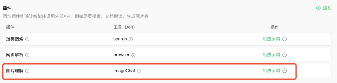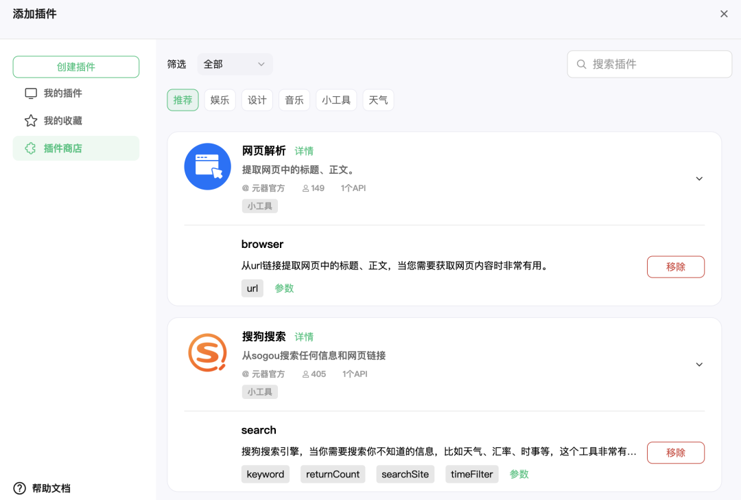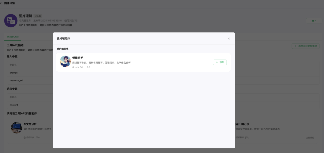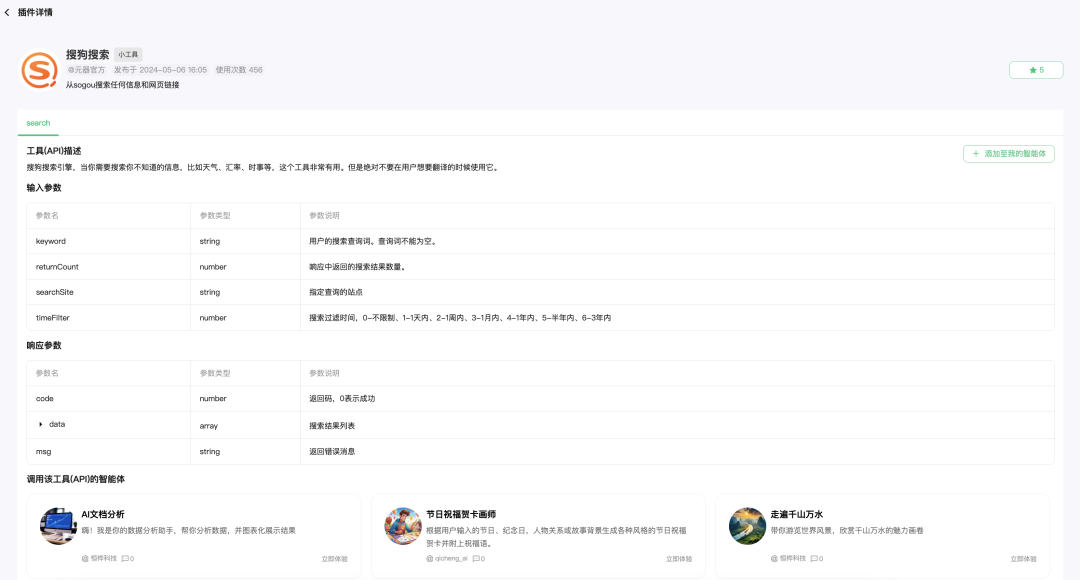 用户可以搜索商店内的插件,收藏插件,点击单个插件进入浏览「插件详情」:包括API的描述、输入参数与响应参数的名称、类型、说明,调用了该插件的智能体;用户还可以在「插件详情」页右上角快速将该插件添加至自己创建的智能体。